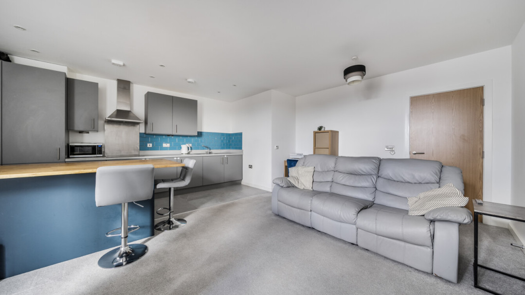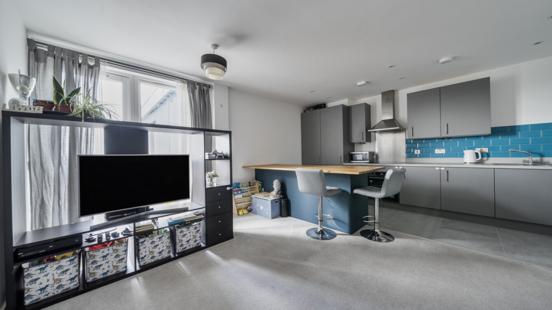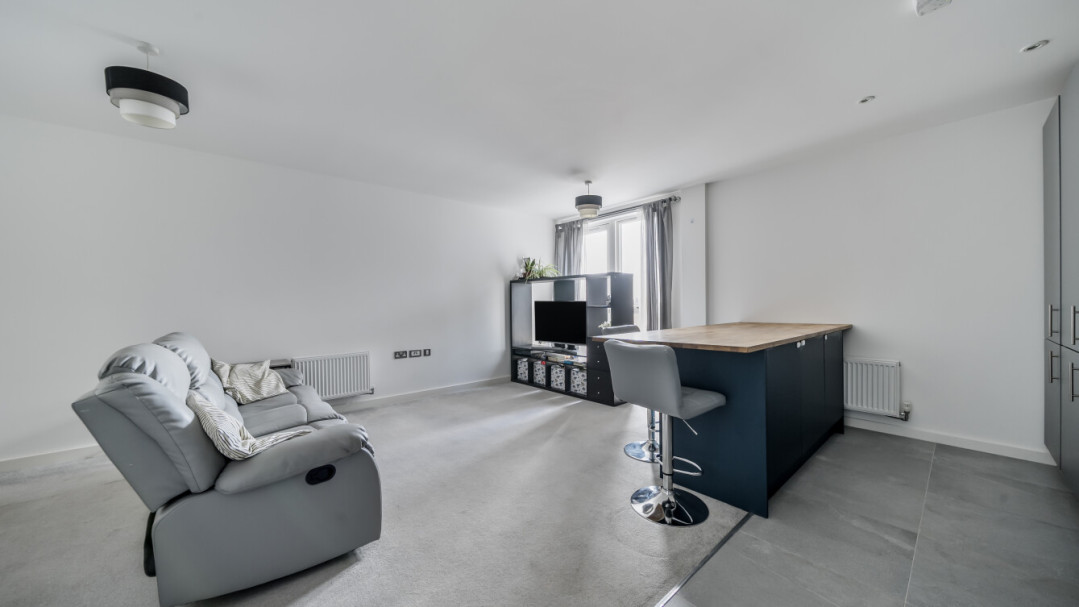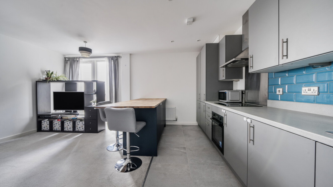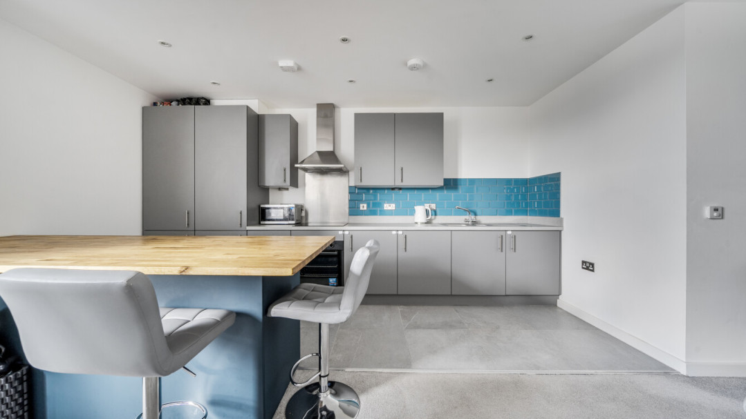 This well-presented one-bedroom top floor flat is available to purchase through Shared Ownership and offers modern living in a highly convenient location. The spacious entrance hallway welcomes you with a generous storage cupboard, leading to a stylish contemporary kitchen finished in a matt design with integrated appliances, a full-height fridge freezer, washer dryer, electric oven and hob, stainless steel extractor hood, and splashback. A standout feature of this home is the large statement island unit in matt blue with a wooden top, providing additional workspace, storage, and a casual dining area.