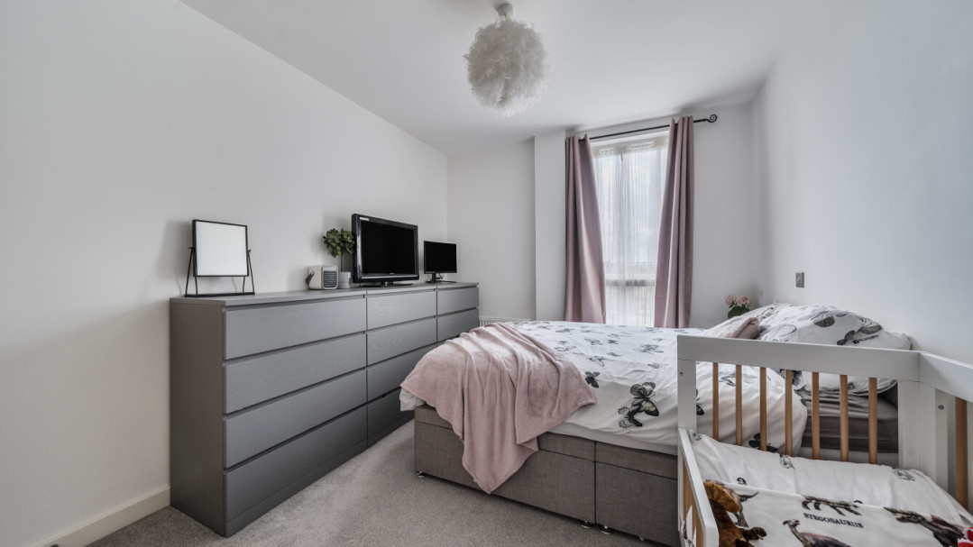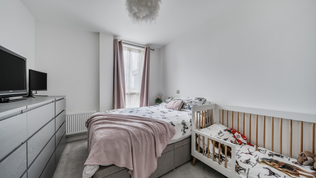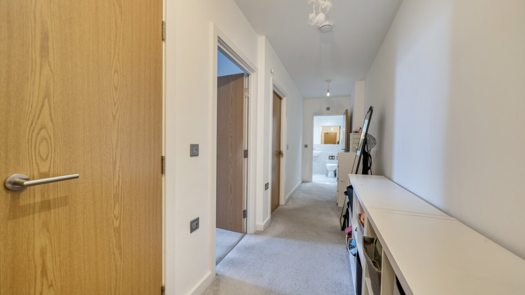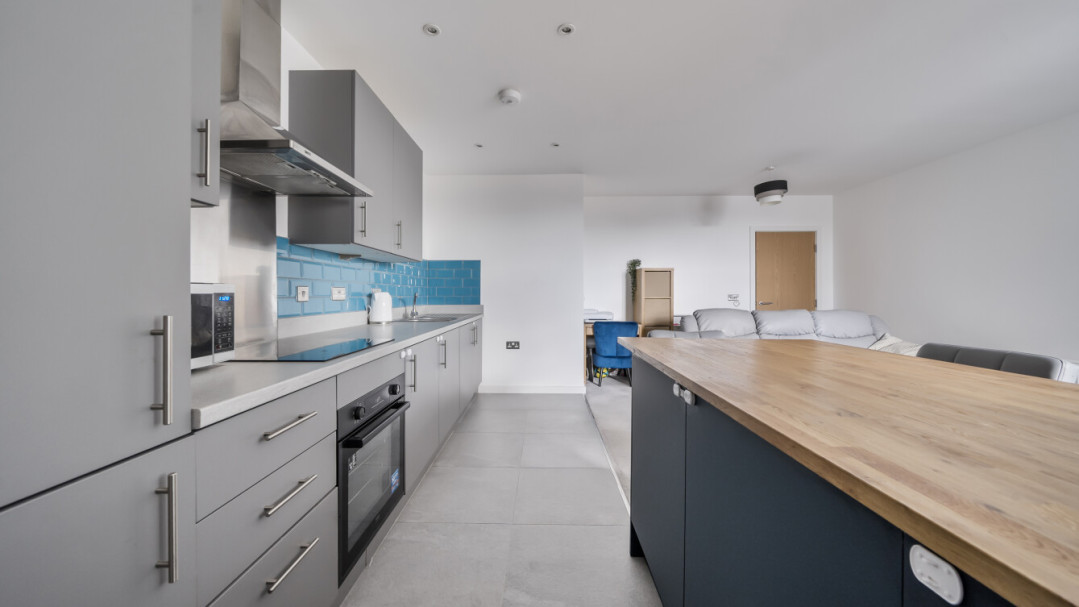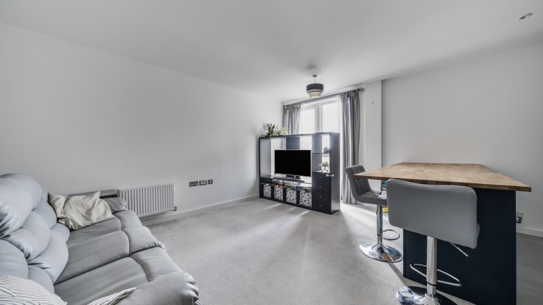 This well-presented one-bedroom top floor flat is available to purchase through Shared Ownership and offers modern living in a highly convenient location. The spacious entrance hallway welcomes you with a generous storage cupboard, leading to a stylish contemporary kitchen finished in a matt design with integrated appliances, a full-height fridge freezer, washer dryer, electric oven and hob, stainless steel extractor hood, and splashback. A standout feature of this home is the large statement island unit in matt blue with a wooden top, providing additional workspace, storage, and a casual dining area.