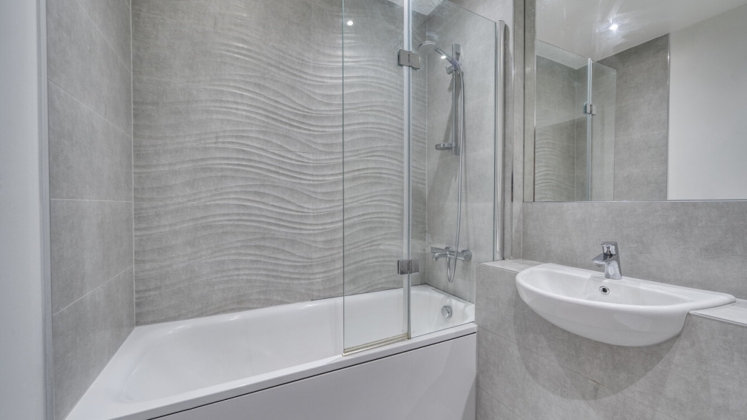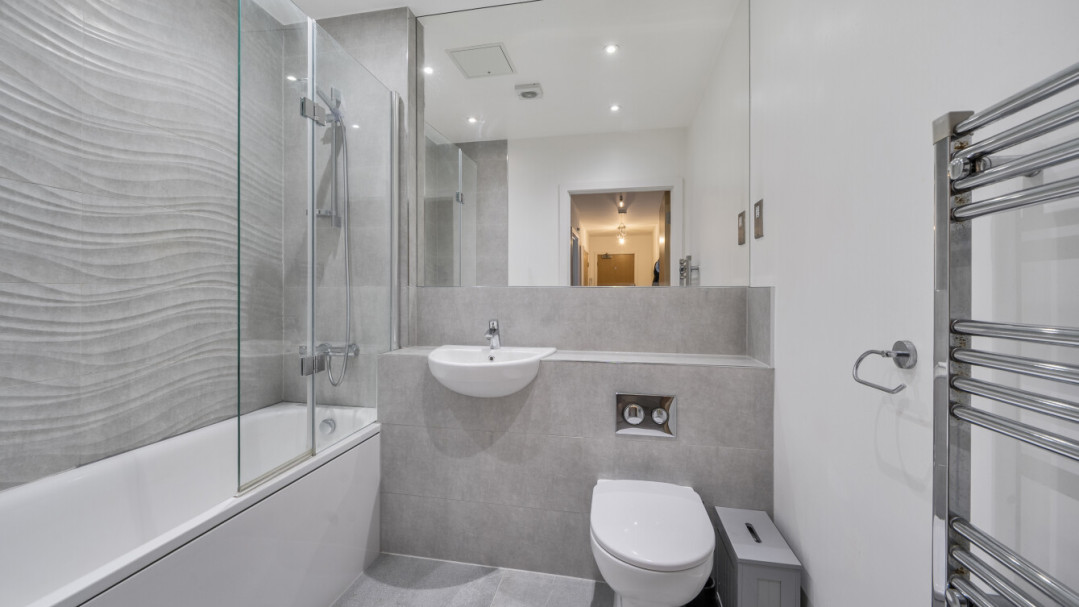- Modern bathroom suite with chrome fittings and full-width mirror