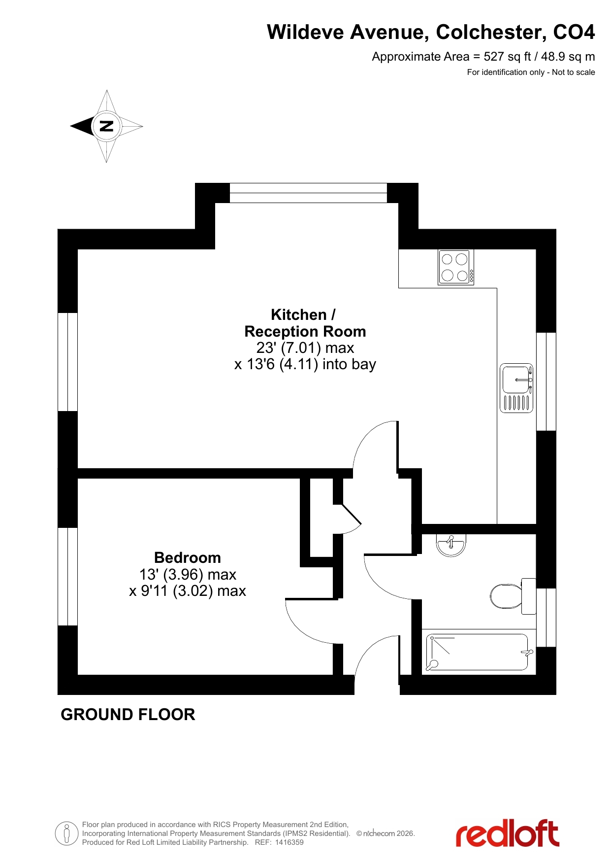 Extending to approximately 48.9 sqm, the property features a bright and spacious open-plan kitchen and reception room, and enhanced by a bay window that fills the space with natural light. The modern kitchen is fitted with integrated appliances, creating a sleek and practical environment ideal for both everyday living and entertaining.