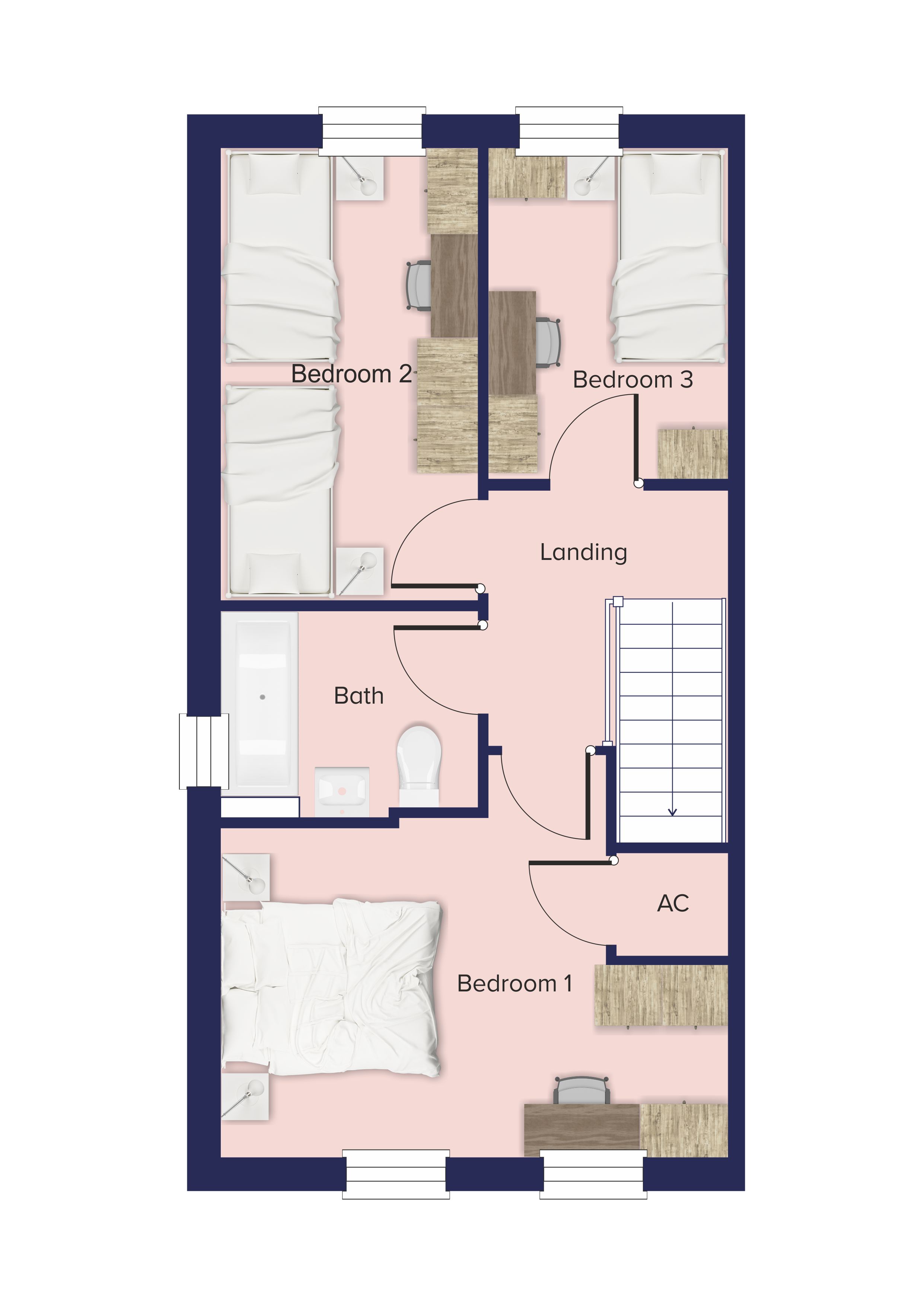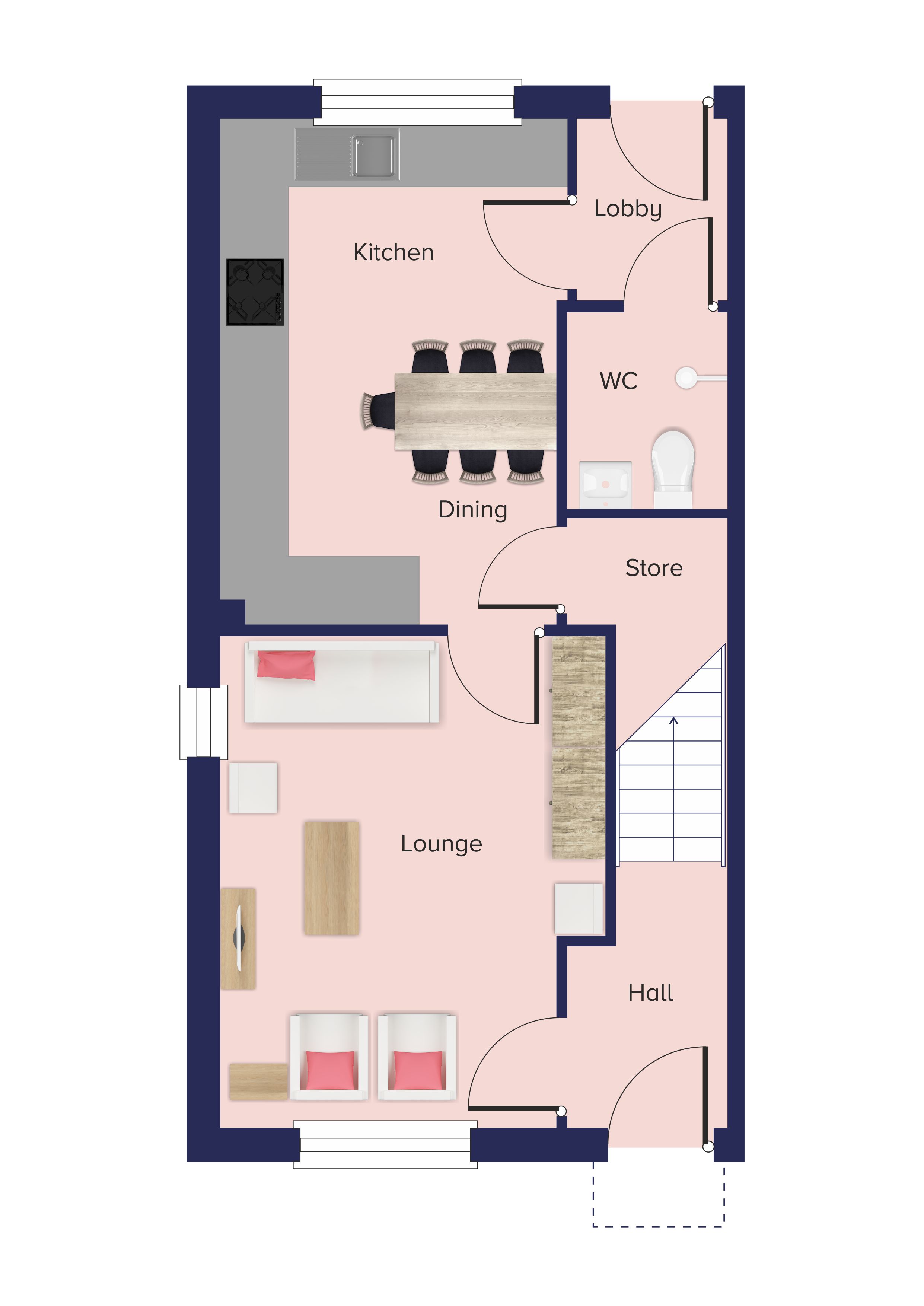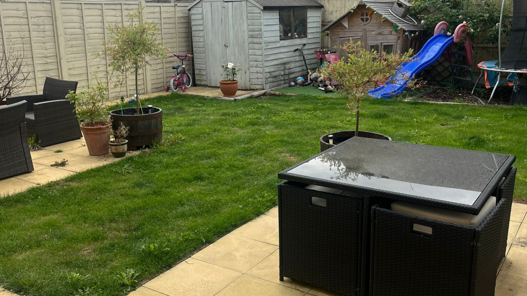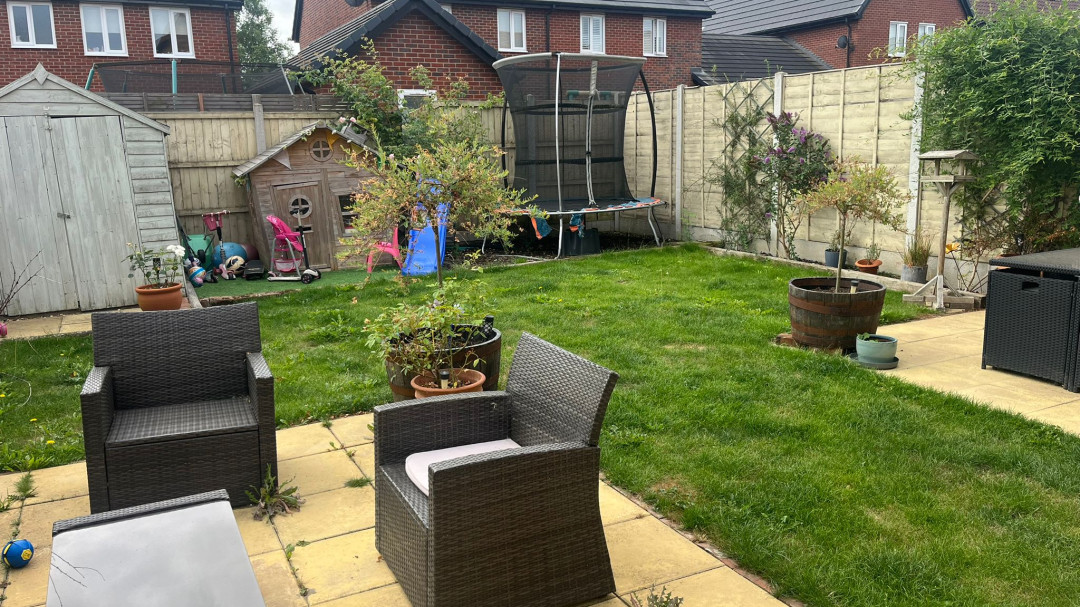 On the ground floor, the property features an entrance lobby, spacious living room, fitted kitchen, rear lobby and WC. Upstairs there are three bedrooms and a family bathroom. Outside, the landscaped garden includes a timber shed, while the private driveway provides space for two cars.