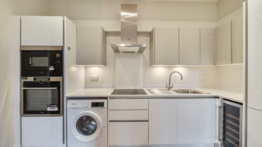 The contemporary fitted kitchen provides excellent storage and is fully equipped with integrated appliances including a hob, oven, microwave, drinks fridge and a freestanding washer.