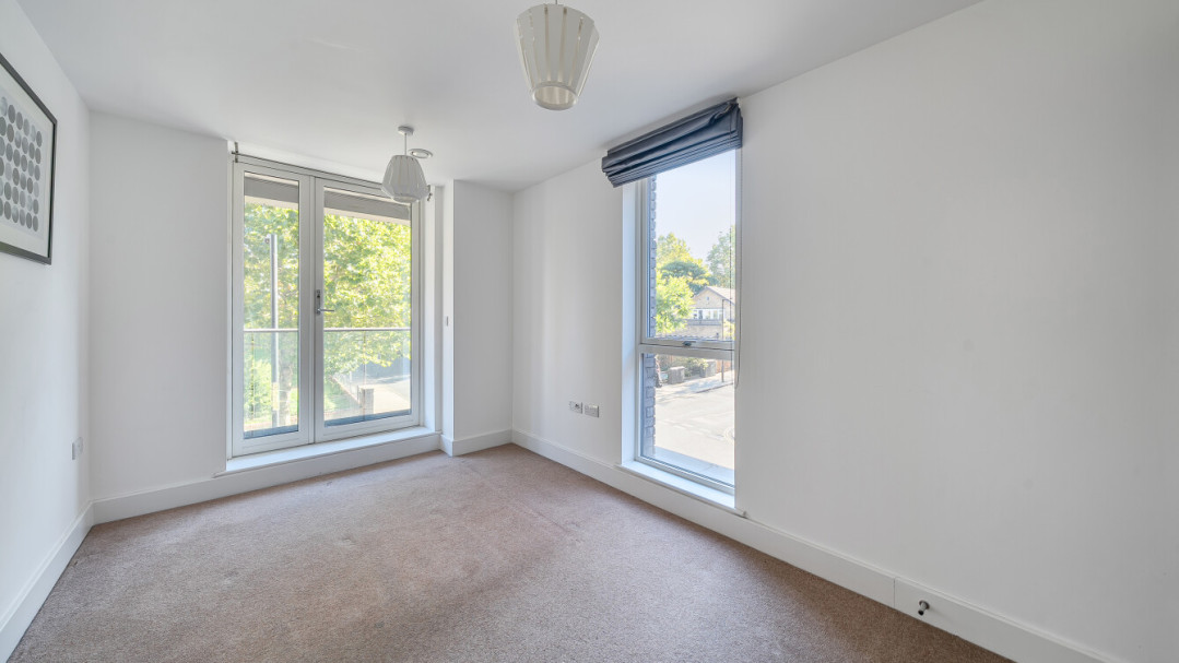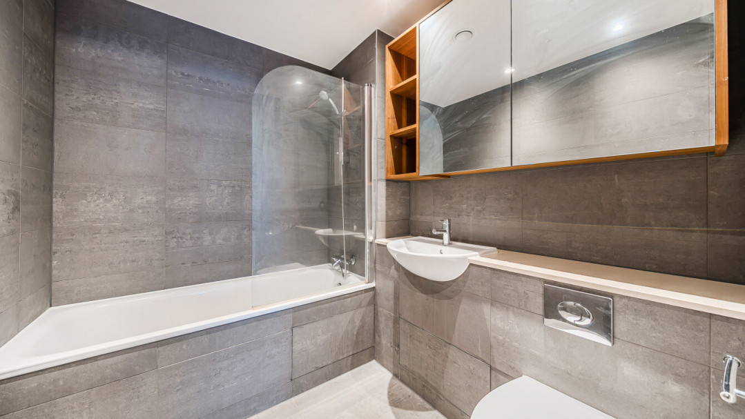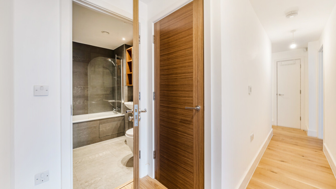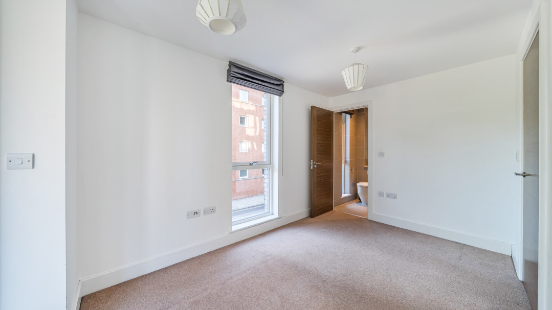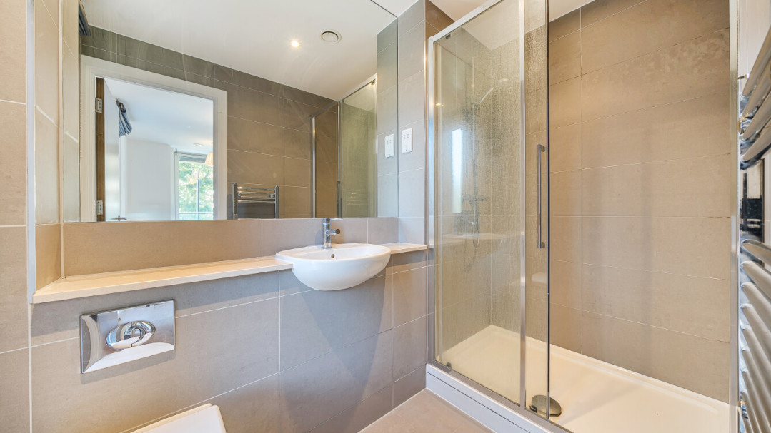 The apartment features two generous bedrooms, with the principal bedroom benefitting from an en-suite shower room. Both bathrooms are finished to a high standard, with modern tiling, storage solutions, and chrome towel rails.