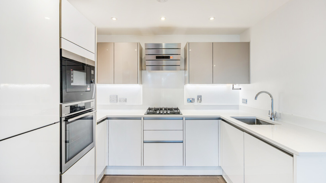 The fully fitted kitchen is sleek and well-designed, providing excellent storage and integrated appliances including a gas hob, oven, and microwave - perfect for both everyday cooking and entertaining guests.