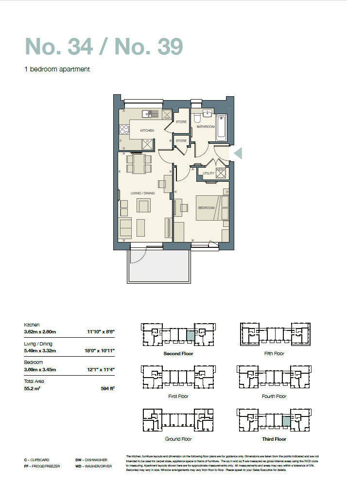 Plot 3.07 / Flat 39 is a stylish third-floor apartment measuring 55.3m². The property features a welcoming entrance hall with a convenient storage cupboard and washer, a modern L-shaped fitted kitchen with integrated appliances, and a bright open-plan living area leading onto a private balcony, accessible from both the lounge and bedroom. The spacious bedroom benefits from built-in wardrobes, while the contemporary bathroom is finished to a high standard with full tiling, a shower-over-bath, and a chrome heated towel rail.